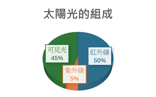 太陽光的組成大致上可分為「紅外線」約50%、「紫外線」約2~5%、「可見光」約45%;其中紫外線又可細分為UVA(長波紫外光)、UVB(中波紫外光)、UVC(短波紫外光)。
