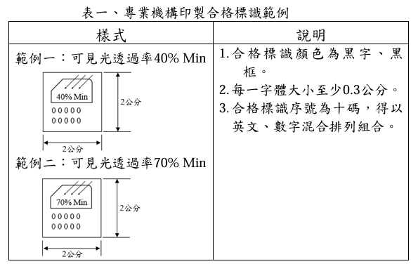 四、(一)、.2專業機構印製:申請者取得合格標識後應依公路監理機關規定逐一標示於產品上。
