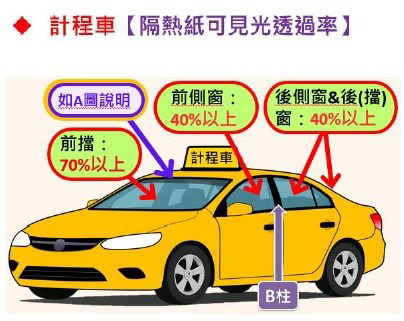 其中規範指出:前擋玻璃隔熱紙透光度須高於70%、前側窗隔熱紙透光度須高於40%,後側窗與後擋則不予規範,而對於計程車則基於治安考量,後側窗及後擋窗另訂有隔熱紙透光度須高於40%的規範。