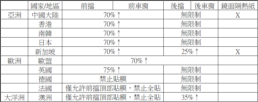 目前國際上的共識是玻璃本身+隔熱紙透光度必須高於70%,關於各國法規詳情請見下圖: