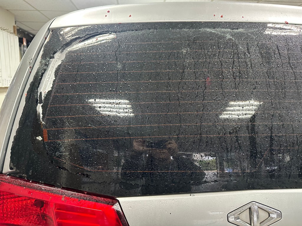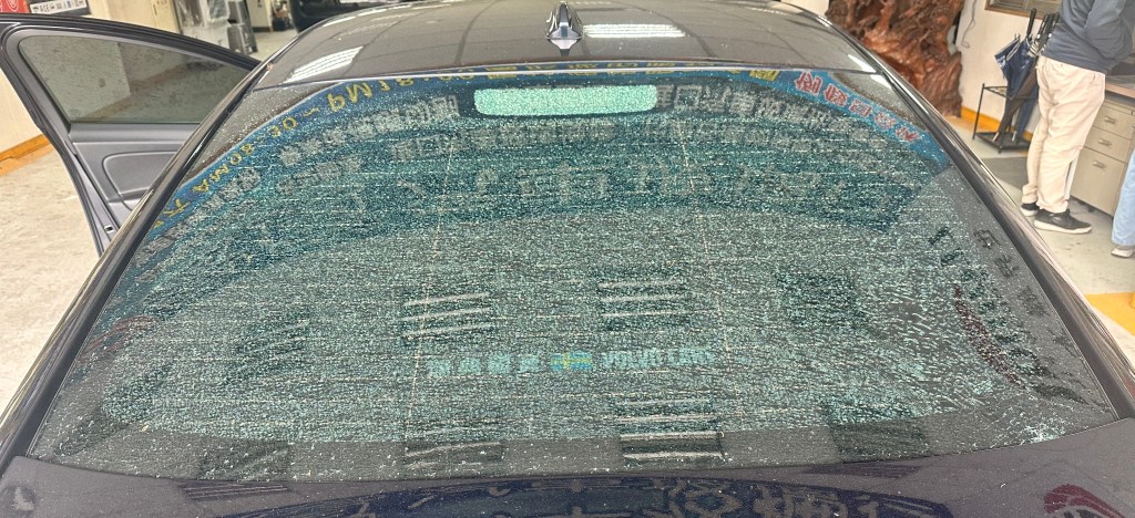 從圖片中可見,一輛車的後擋風玻璃發生破裂。一般而言,未貼隔熱紙的後擋玻璃,由於其材質多為強化玻璃,在受衝擊後會碎裂成無數細小碎片,四散至車內外各處,增加清理困難與安全風險。然而,若玻璃上貼有隔熱紙,即便破裂,玻璃碎片仍能緊貼在隔熱紙上,保持整片狀態,類似保護膜的作用,有效降低二次傷害的風險。