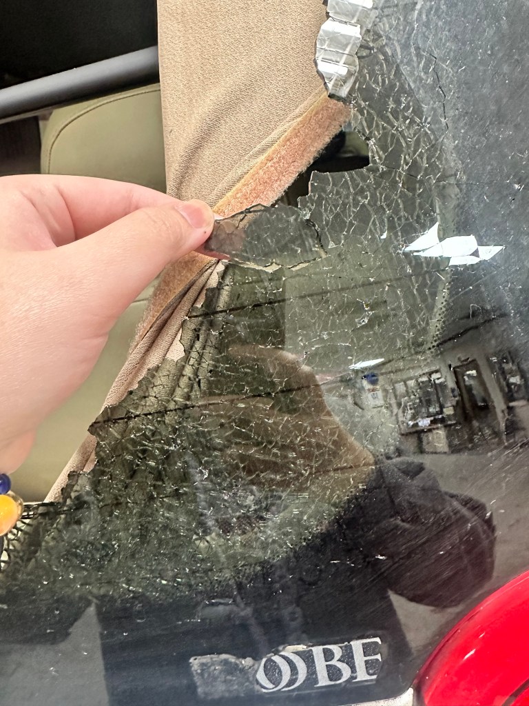相反地,從以下兩個案例可觀察到,未張貼隔熱紙的車輛在玻璃破裂時,碎片直接四散,難以控制與清理。這不僅影響車內環境,還可能對乘客、車內設備及個人物品造成潛在傷害。